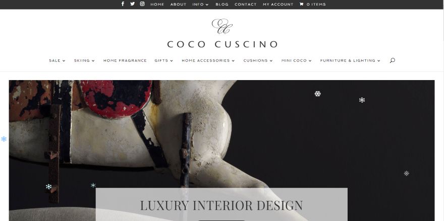 Coco Cuscino include un glisor pe ecran complet, cu un magazin CTA pentru diferite categorii. Derularea afișează un glisor cu cele mai recente produse cu un titlu de secțiune în stânga. O altă secțiune include CTA-uri pentru diferite categorii. Categoriile și paginile de produs sunt simple și au borduri, butoane și stil text și un subsol personalizat. Pagina produsului include o umbră de cutie.