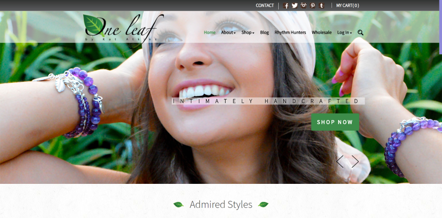 One Leaf Designs afișează imaginile produselor într-un glisor cu lățime completă, cu un CTA de magazin urmat de o secțiune cu cei mai buni vânzători. Pagina magazinului afișează produsele într-o secțiune în cutie care se suprapune antetului. Paginile produsului arată produsul cu o umbră de cutie pentru toate imaginile. Textul este conceput pentru a se potrivi site-ului. Include link-uri către alte produse pe care vizitatorul le-ar putea dori.