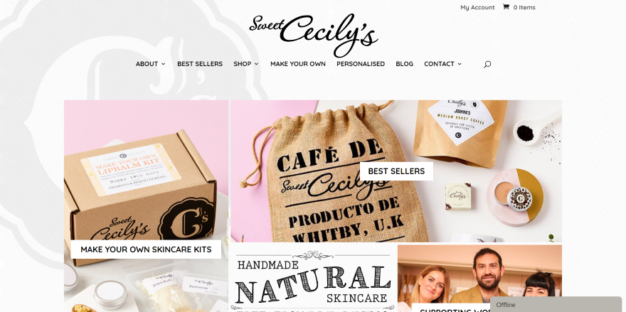 Sweet Cecilys afișează imagini ca linkuri către categoriile de magazine într-un aspect cu mai multe coloane, care arată similar unei reviste. Fundalul prezintă o parte din sigla companiei. Paginile de categorii includ același model de fundal ca și pagina de pornire și afișează produsele în patru coloane. Paginile de categorii au widget-uri WooCommerce în bara laterală, care sunt concepute pentru a se potrivi cu produsele. Paginile de produse utilizează bara laterală și adaugă butoane de partajare socială și produse conexe. Acest site are o fotografie uimitoare a produsului.