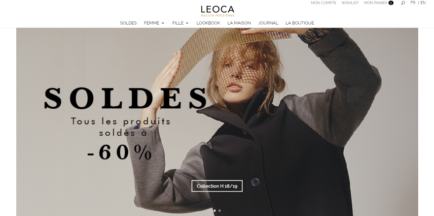 Leoca afișează un antet pe ecran complet cu un magazin CTA. Următoarea secțiune prezintă imagini mari care leagă de categorii. Acestea includ titlurile categoriei. Paginile categoriei arată o imagine pe ecran complet împreună cu titlul categoriei. Următoarea secțiune prezintă un produs urmat de un modul de magazin cu imagini mari și animație cu mouse-ul pentru suprapuneri pentru a afișa dimensiunile și o inimă pentru a adăuga produsul la lista de dorințe. Paginile produsului prezintă o mulțime de imagini mari împreună cu opțiuni.