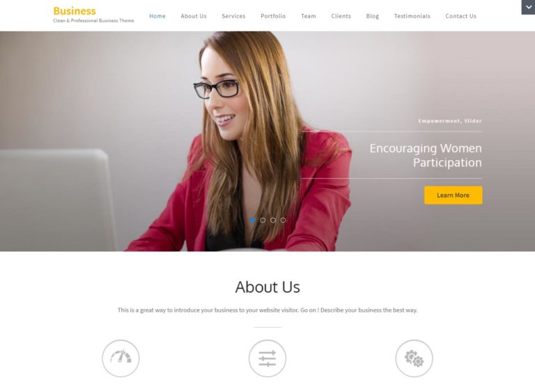 Pagina principală include o imagine de antet mare care se suprapune cu unele casete de conținut. Acestea sunt grozave pentru a prezenta servicii, produse sau chiar oameni din echipa ta. Tema prezintă pictograme și culori frumoase, împreună cu anteturi și butoane care merg în fața imaginii antetului.
