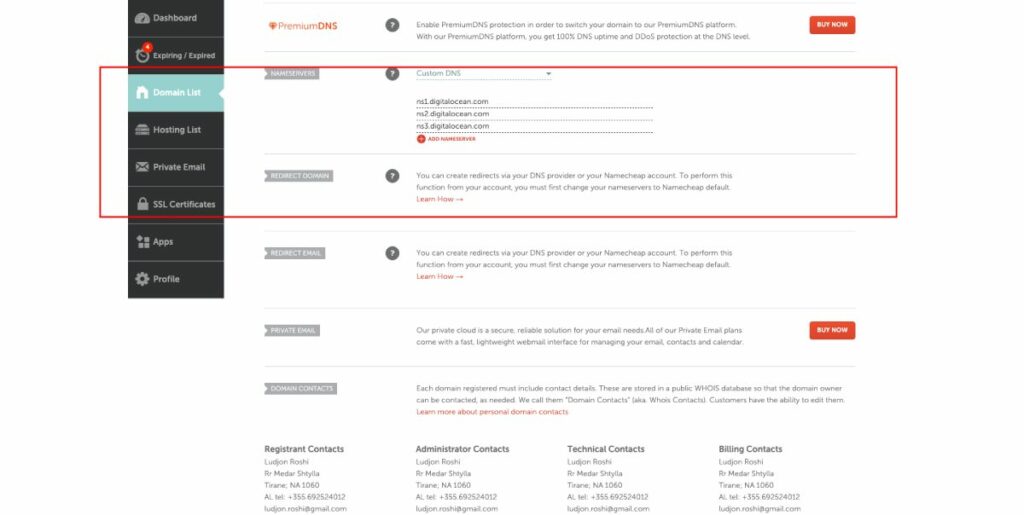 Odată ce ați finalizat înregistrarea domeniului, trebuie să direcționați înregistrările serverului de nume (NS) ale domeniului către DigitalOcean. Pentru a face acest lucru, urmați acești pași: