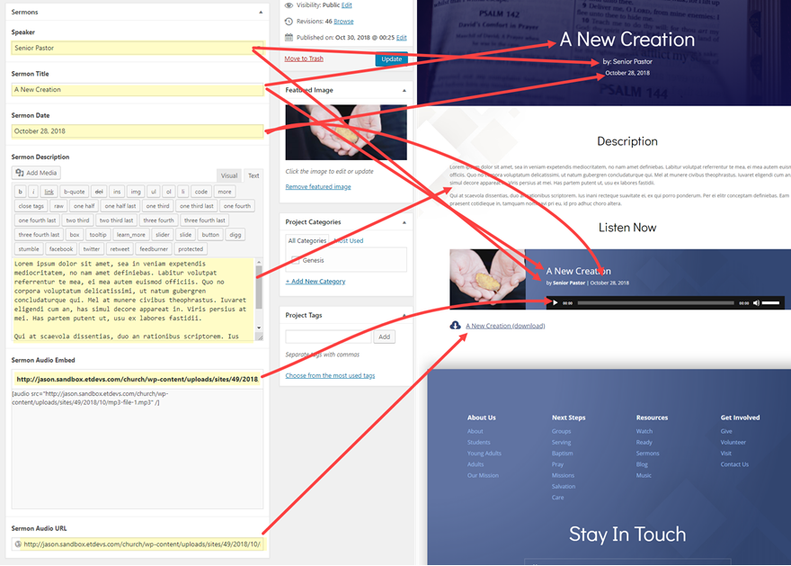 Sper că acest tutorial vă va ajuta să aruncați mai multă lumină asupra conținutului dinamic și a modului în care poate fi utilizat cu pluginul Advanced Custom Fields pentru a crea un aspect puternic pentru predici. S-ar putea să dureze ceva timp pentru a configura totul, dar recompensa poate merita cu siguranță. Desigur, același proces poate fi folosit pentru a crea tot felul de conținut dinamic pentru diferite tipuri de postări. Spuneți-mi dacă aveți întrebări în comentariile de mai jos. Aștept cu nerăbdare să ne auzim.