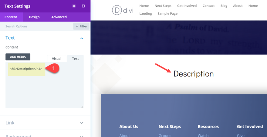 Acum suntem gata să începem să construim conținutul audio din predica dinamică pentru secțiunea noastră. Pentru început, vom adăuga descrierea predicii chiar sub modulul text cu titlul „Descriere”. Pentru aceasta, adăugați un nou modul de text. Plasați cursorul peste caseta de introducere a conținutului și faceți clic pe pictograma conținut dinamic.