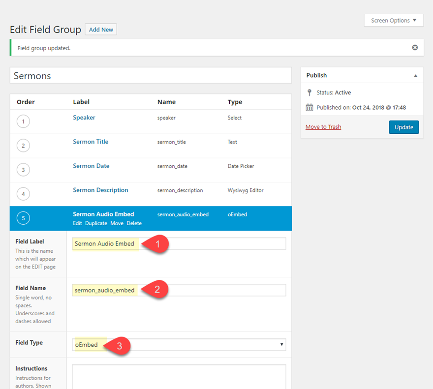Apoi, adăugați un câmp personalizat pentru încorporarea audio a predicii folosind tipul de câmp oEmbed. Acest lucru ne va permite să încorporăm o încorporare audio a predicii prin simpla actualizare a adresei URL audio pentru încorporare pe backend.