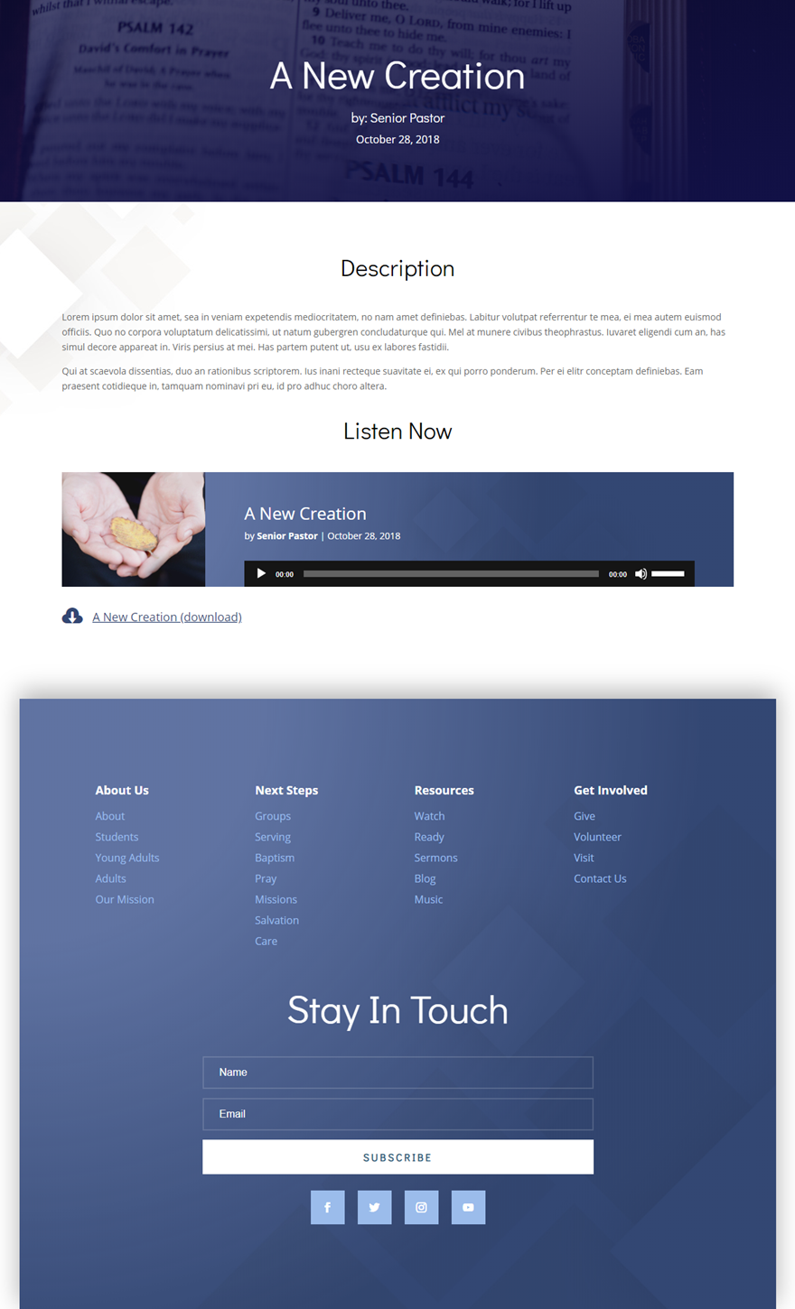 Uneori, este util pentru utilizatori să descarce fișierul audio. Pentru a face acest lucru mai ușor, puteți adăuga un link către fișierul audio la postarea dvs. Pentru a face acest lucru, vom folosi conținut dinamic pentru a completa un modul blurb cu titlul predicii și url-ul audio.
