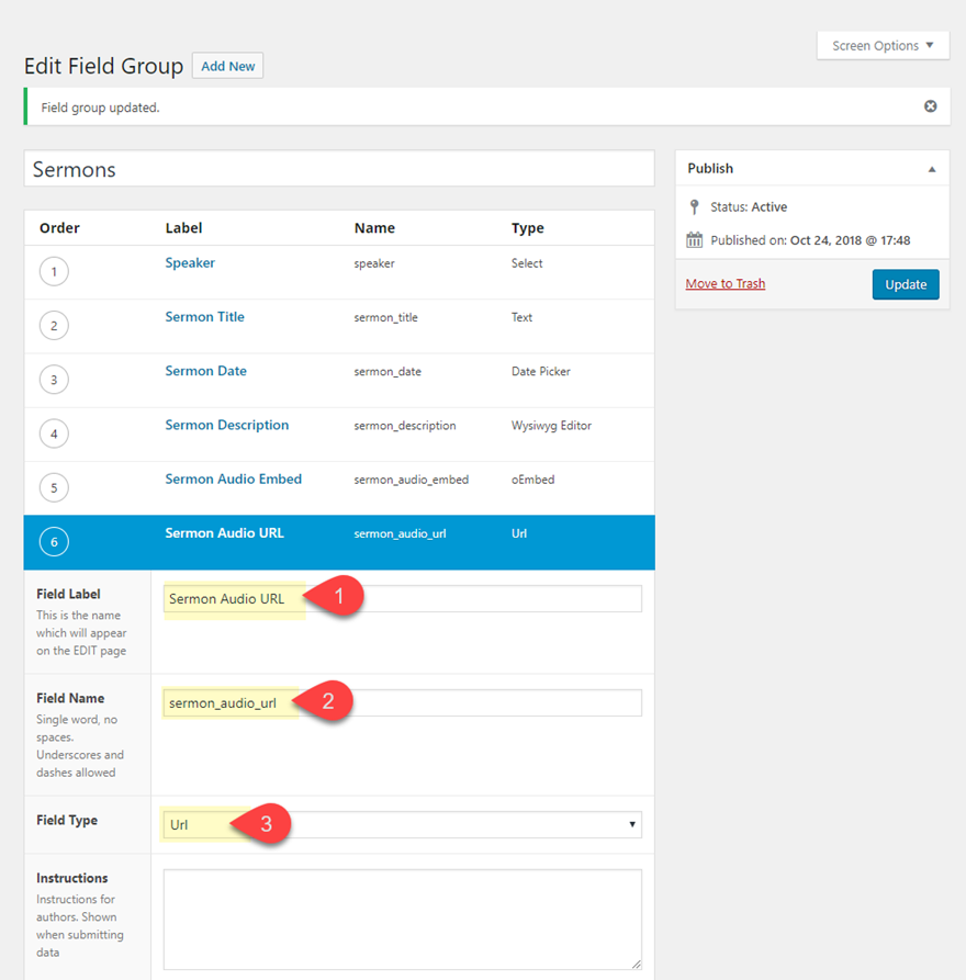 Bine. După ce câmpurile personalizate au fost adăugate la grupul nostru de câmpuri, nu uitați să salvați grupul de câmpuri. Acum putem începe să creăm aspectul predicii pentru conținutul predică al câmpului personalizat pentru a fi folosit ca conținut dinamic pe tot parcursul postării.
