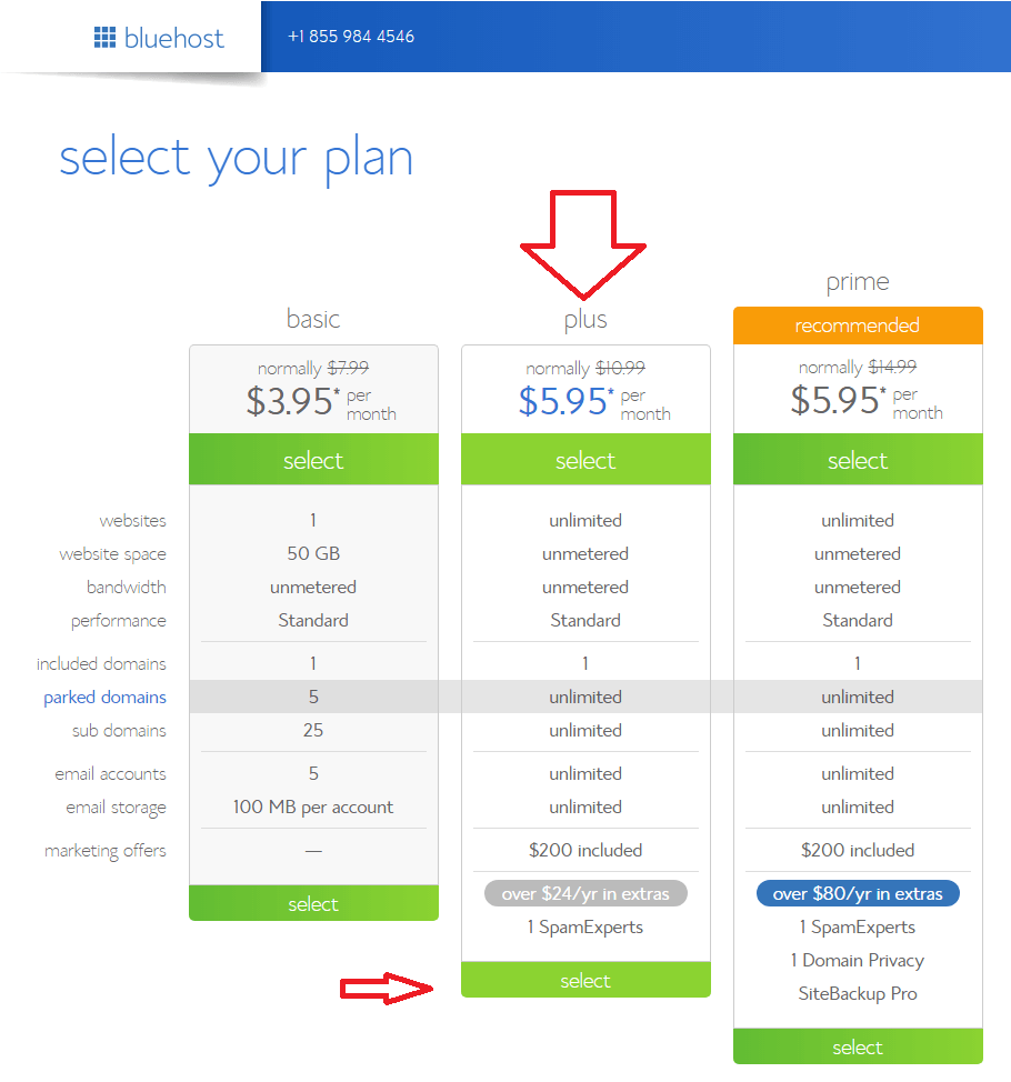 Vizitați BlueHost.com și alegeți un plan de găzduire la alegere. Planul Bluehost Plus vine cu un nume de domeniu gratuit și veți putea găzdui mai multe site-uri web.