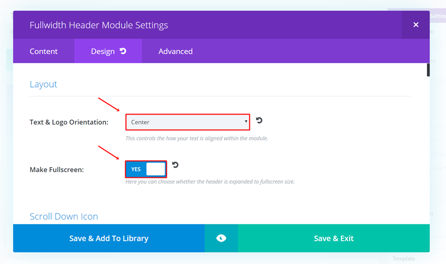 În secțiunea Fullwidth, adăugați un antet Fullwidth. Apoi, accesați fila Proiectare, puneți Orientarea textului și siglei pe „Centru” și activați și modul ecran complet al antetului dvs. cu lățime completă.
