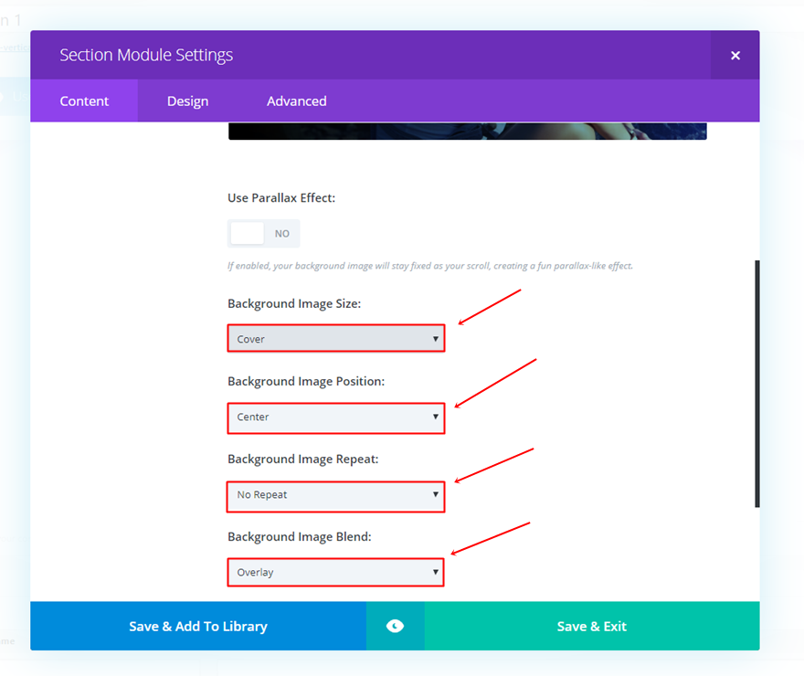 Apoi, deschideți setările Secțiunii lățime completă pentru a adăuga o imagine de fundal cu suprapunere în gradient în subcategoria de fundal a filei Conținut. În funcție de tipul de fundal și de culorile pe care le utilizați, adăugați culori potrivite.