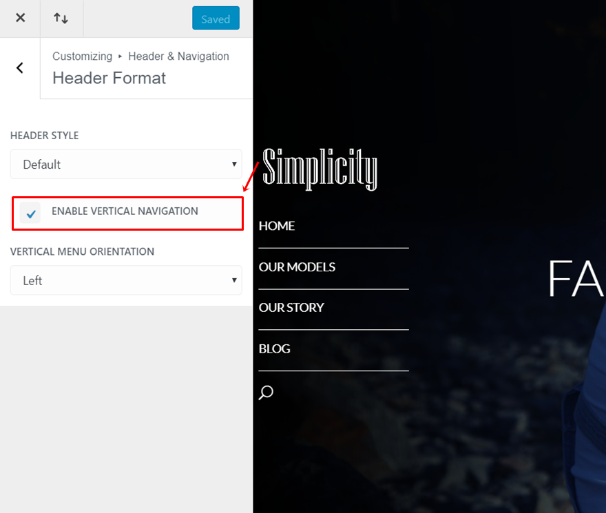 Pentru început, trebuie să activați navigarea verticală pe site-ul dvs. web. Pentru aceasta, accesați Tabloul de bord WordPress> Aspect> Personalizare> Antet și navigare> Format antet> Și activați Navigarea verticală.