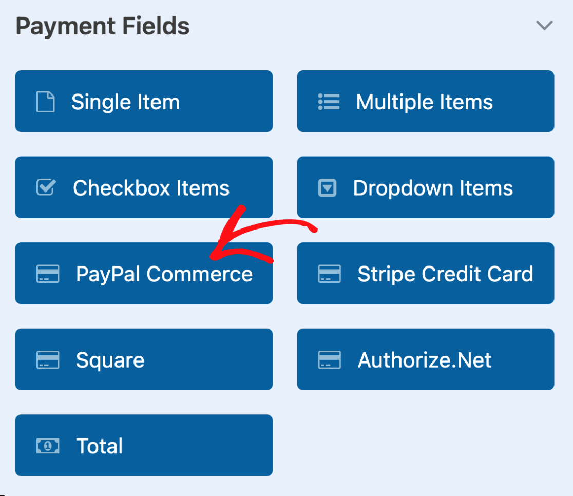 Mai întâi, parcurgeți panoul de câmpuri de formular pentru a găsi câmpul PayPal Commerce în secțiunea Câmpuri de plată. Trageți și plasați-l în zona de previzualizare a formularului.