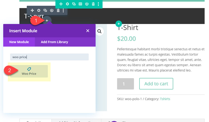 Apoi, adăugați un modul de preț woo făcând clic pe pictograma plus gri care apare atunci când treceți peste modulul de titlu woo pe care tocmai l-ați creat.