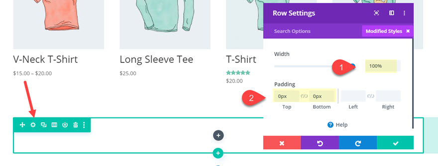 Pentru a crea bara lipicioasă de notificare a coșului, creați mai întâi un nou rând cu o coloană în partea de jos a paginii produsului. Apoi actualizați setările rândului după cum urmează: