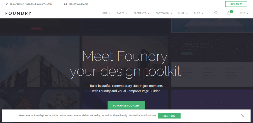 Este o temă WordPress curată, dinamică, multi-concept și multifuncțională. Tema Foundry WordPress este o temă foarte apreciată, cu o evaluare de 4,89 stele pe ThemeForest. Această temă cu siguranță a mulțumit clienților. Tema este plină de caracteristici și funcționalități utile, plugin-uri premium, design solid și personalizare ușoară. Caracteristicile temei includ Panou de opțiuni puternice, Compozitor vizual, Optimizat SEO, Stiluri de subsol multiple, 17 Aspecte de portofoliu, Sistem de grilă puternic, Design receptiv, Aspecte de zidărie, opțiune de culoare cu un singur clic, WooCommerce Ready și multe altele.