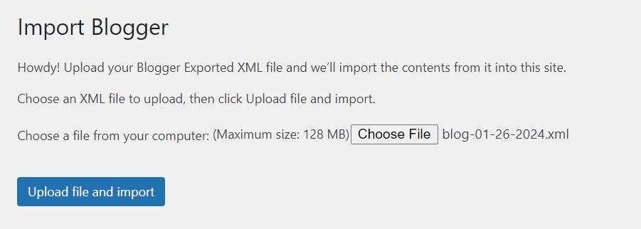 Acum, selectați fișierul .xml pe care l-ați descărcat de pe Blogger. Apoi, faceți clic pe Încărcați fișierul și importați :