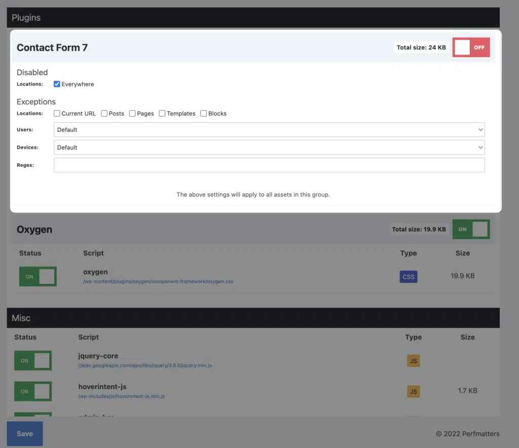 Cu Perfmatters, puteți dezactiva acest plugin pentru a se încărca pe fiecare pagină.