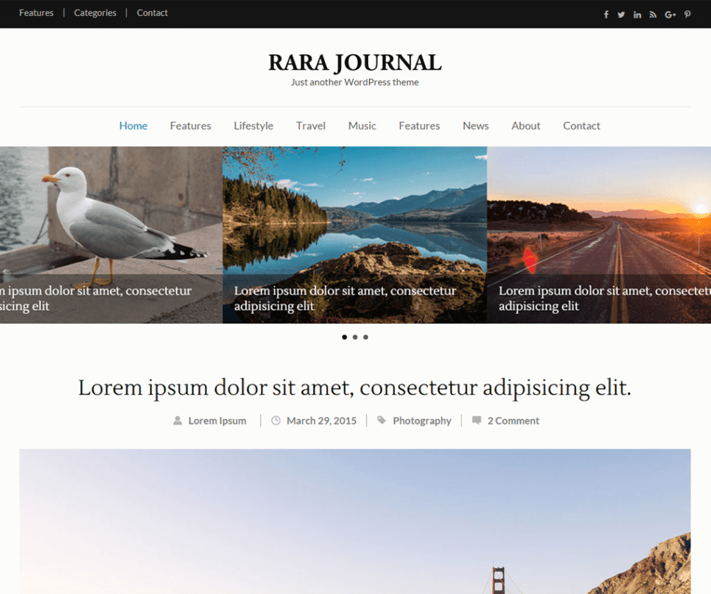 Rara Journal este o temă WordPress pentru publicații curată și elegantă. În plus, este un design atrăgător, cu nuanță strălucitoare ca culoare dominantă pentru a face clienții să cunoască ușor conținutul dvs. În plus, tema integrează imagini gratuite de înaltă calitate și spațiu pentru sesiunea de blog. De asemenea, vine cu multe elemente de vârf, cum ar fi compatibilitatea între browsere și aspectul receptiv.