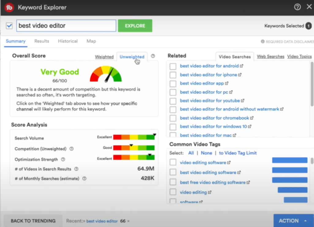 Vă ajută să identificați cuvinte cheie populare și relevante pe YouTube.