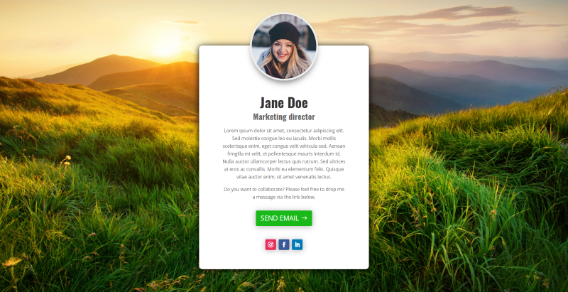 Персональная страница создана для создания персональной целевой страницы. Он предоставляет всю личную информацию на одном экране, чтобы сосредоточиться на конверсиях. Он включает CSS, чтобы гарантировать, что он покрывает 100% экрана. Он обеспечивает область для полноэкранного фонового изображения. Коробка с закругленными углами и участками с теневым эффектом посередине экрана. Изображение в кружке перекрывает верхнюю часть поля. Поле включает имя, заголовок, информацию, кнопку для электронной почты и кнопки подписки в социальных сетях. Если фоновое изображение недостаточно велико, чтобы заполнить экран, внизу останется пустое пространство, а информационное окно будет перекрывать нижнюю часть.