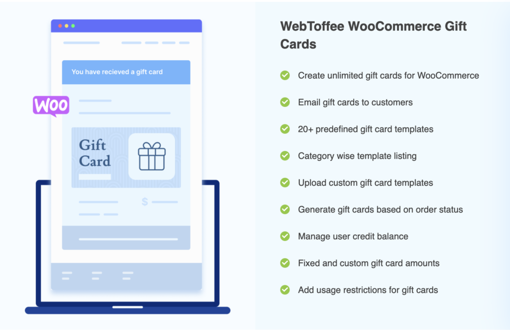 Подарочные карты для WooCommerce — это плагин от WebToffee, специально разработанный для удовлетворения всех расширенных требований к подарочным картам магазинов. Плагин включает в себя все мелкие и крупные функции, которые подходят для удовлетворения требований вашей подарочной карты WooCommerce.