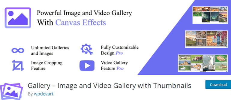 Галерея — это бесплатный плагин галереи изображений WordPress, который позволяет демонстрировать изображения с привлекательной анимацией и эффектами просмотра. Он также предлагает различные виды анимации холста. Кроме того, вы можете настроить дизайн в соответствии с вашими потребностями.
