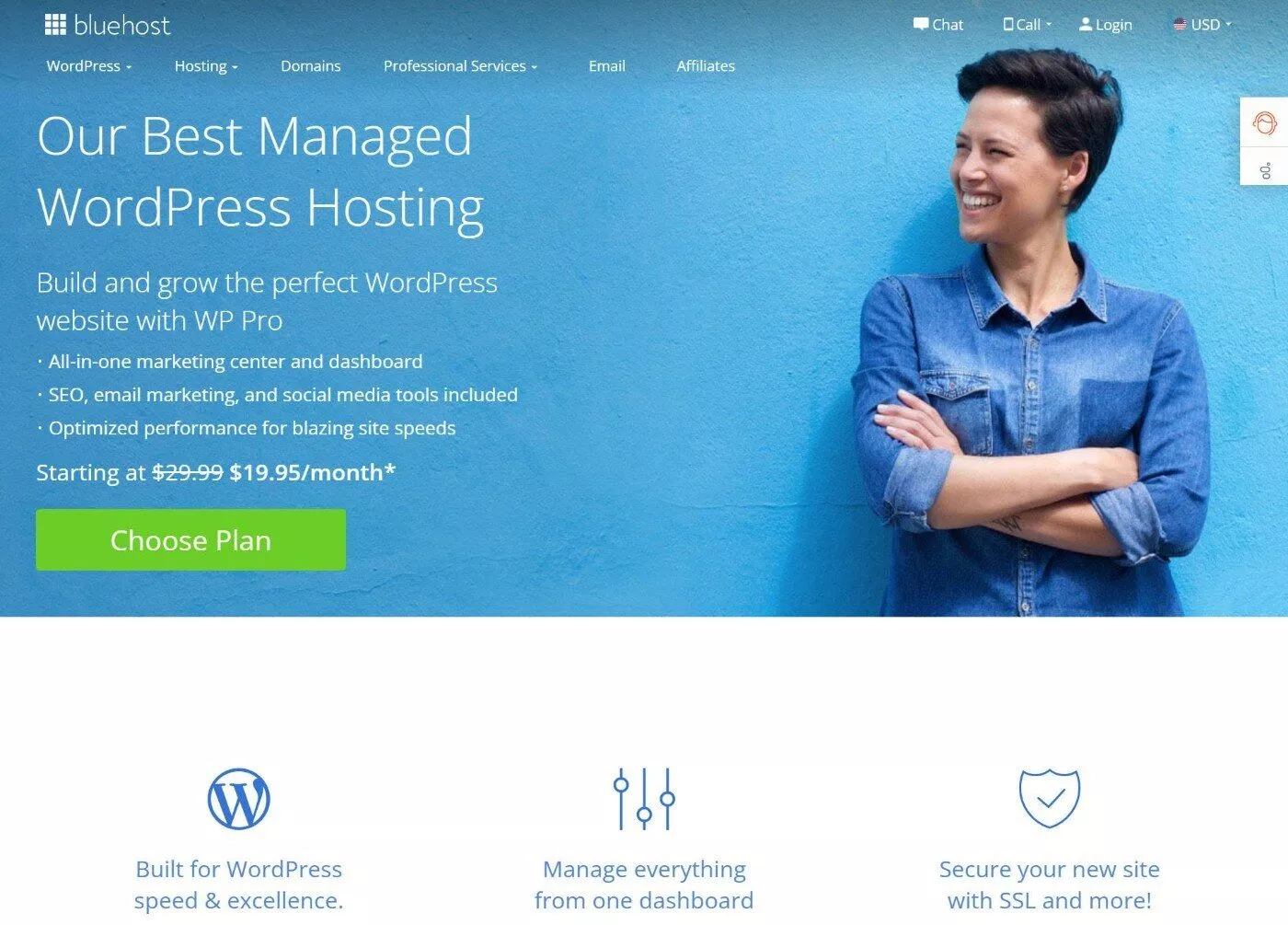 Для людей, которым нужно больше, чем общие планы Bluehost, Bluehost также предлагает управляемый хостинг WordPress, который называется WP Pro.