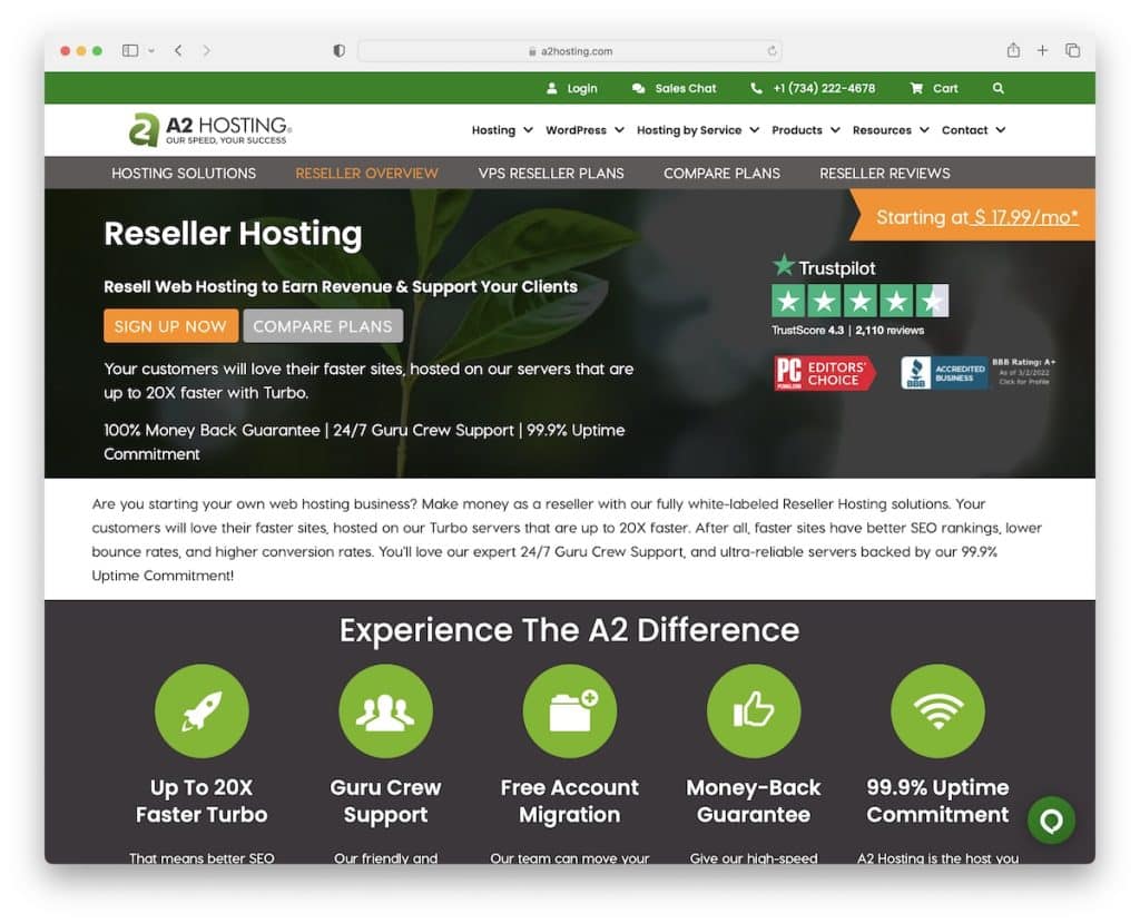 - Хостинг A2 : Если вас больше всего беспокоит скорость, хостинг A2 не разочарует. Они предлагают турбо-серверы, которые обещают до 20 раз более быструю загрузку страниц и отличное обслуживание клиентов, что делает их фантастическим выбором для реселлеров.