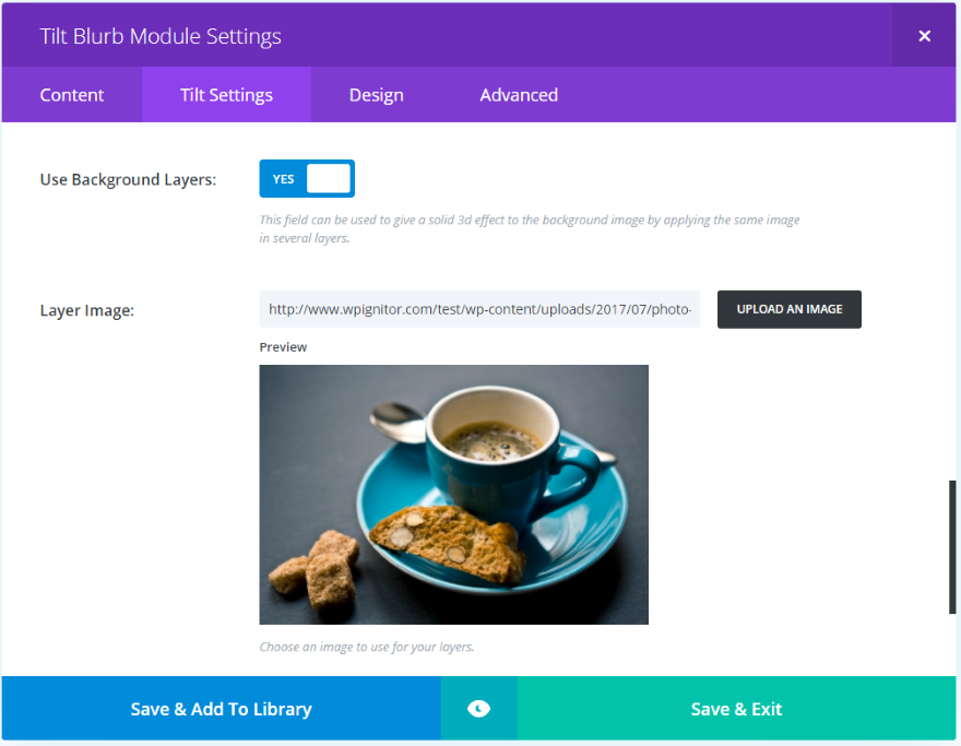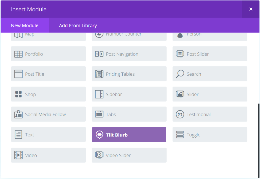 В Divi Builder добавлен новый модуль под названием Tilt Blurb. Он окрашен в фиолетовый цвет в Divi Builder, поэтому его трудно не заметить. Мне нравится, когда разработчики используют разные цвета для своих модулей, чтобы они выделялись среди стандартных модулей (чего бы это ни стоило).