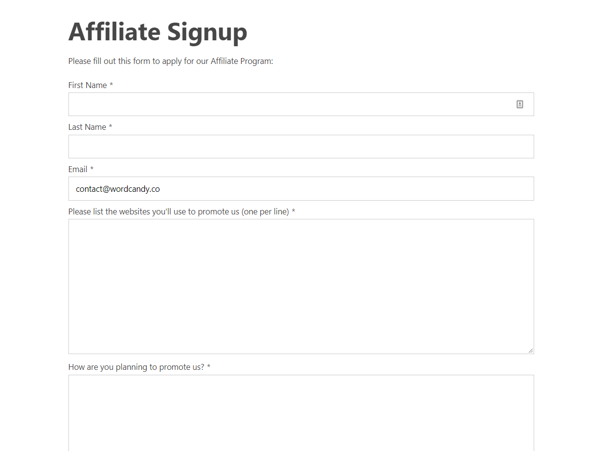 Форма заявки позволяет вам познакомиться с новыми партнерами с помощью базового набора вопросов. Однако плагин не позволяет добавлять новые поля в форму через его настройки. Это упущенная возможность, если вы хотите задать потенциальным партнерам более подробные вопросы об их квалификации, прошлом опыте и многом другом.