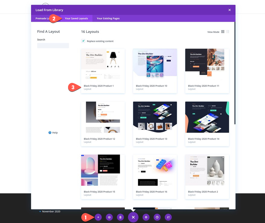 Откройте меню настроек в нижней части внешнего интерфейса Divi Builder и щелкните значок «Загрузить из библиотеки» с плюсом. Выберите вкладку «Ваши сохраненные макеты». Там вы увидите список всех макетов продуктов, которые вы ранее импортировали в библиотеку Divi. Выберите из списка макет продукта, который вы хотите использовать.