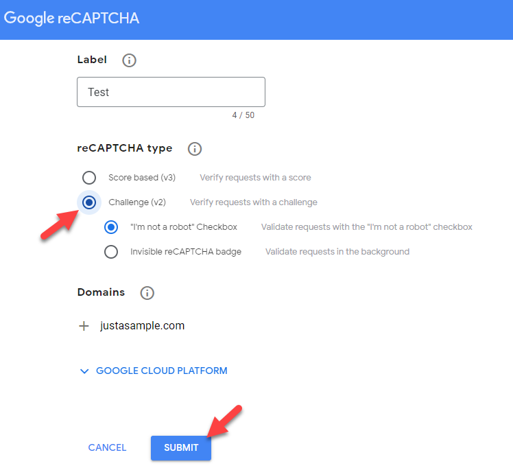Затем введите такие данные, как метка, тип reCAPTCHA и доменное имя. После того, как вы настроили их, нажмите кнопку отправки .