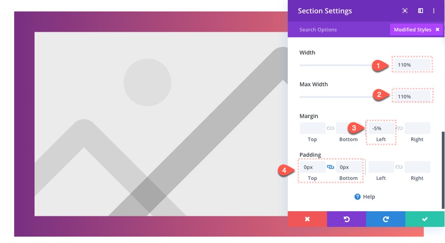 В редакторе макета откройте настройки раздела и обновите ширину следующим образом: