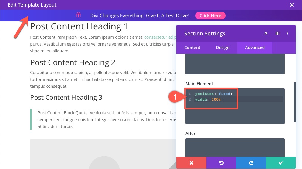 Чтобы промо-панель оставалась под заголовком Divi по умолчанию, мы можем добавить простой фрагмент CSS в раздел, содержащий промо-панель.