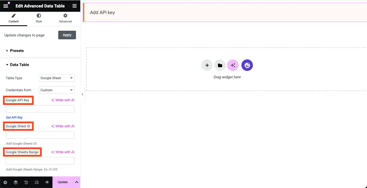 Теперь, чтобы отобразить ваши данные Google Leate в качестве таблицы в WordPress с элементом, вы должны добавить ключ Google API, идентификатор листа Google и диапазон Google Sheets в соответствующих полях, как отмечено на изображении ниже.