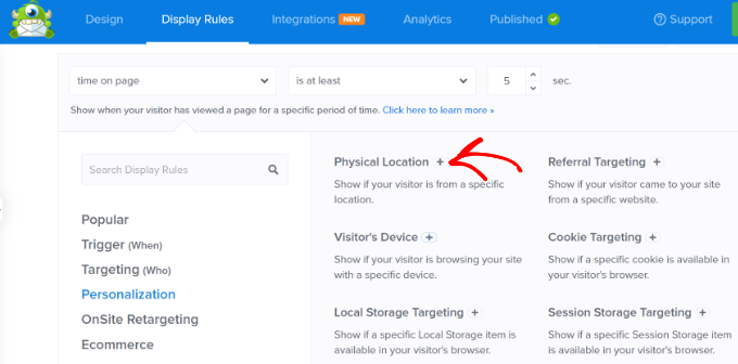 Все, что вам нужно сделать, это выбрать правило отображения «Физическое местоположение» в OptinMonster.