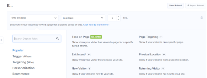 Просто выберите правило отображения «Время на странице», чтобы начать, и установите время на 5 секунд.