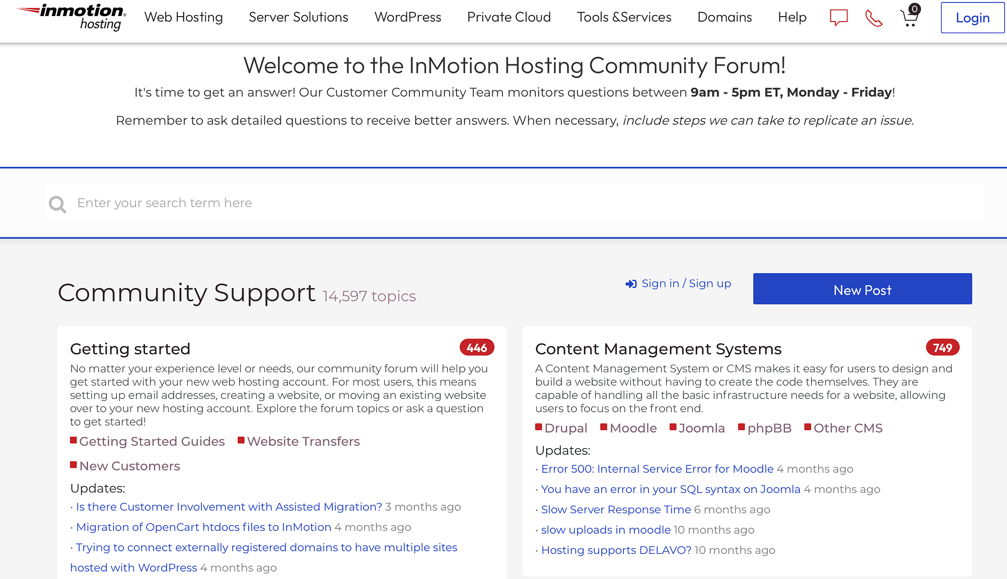 Кроме того, вы можете использовать базу знаний хостинга InMotion и блог, где вы найдете широкий выбор полезных статей. Кроме того, существует активный форум сообщества с модераторами, которые ведут беседу: