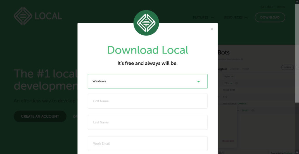 Изначально процесс для DevKinsta практически такой же. Здесь тоже нужно зайти на его сайт и нажать кнопку скачать. Он также запрашивает вашу контактную информацию.
