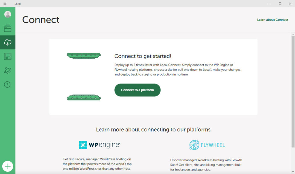 Для первого варианта вы можете использовать функцию Connect , однако она работает только в том случае, если вы являетесь клиентом WP Engine или Flywheel. Если это применимо к вам, нажмите «Подключиться» в левой части пользовательского интерфейса и войдите в свою учетную запись WP Engine или Flywheel.