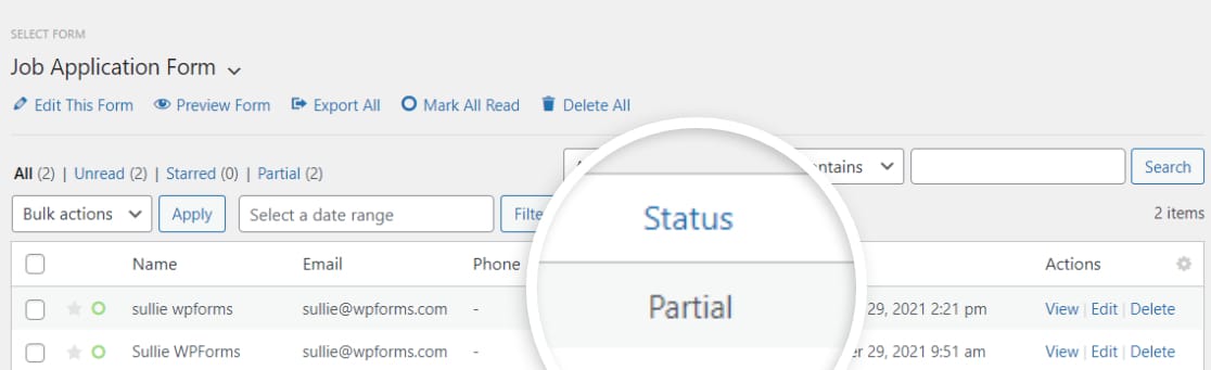 Чтобы просмотреть частичные записи ваших пользователей, перейдите в WPForms » Entries.
