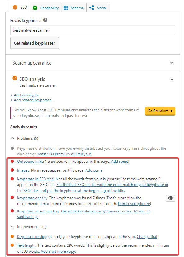Целевое ключевое слово («сканер вредоносных программ») и варианты ключевых слов («сканирование на наличие вредоносных программ», «сканирование вредоносных программ на веб-сайте WordPress» и т. д.) должны естественным образом включаться в статью.