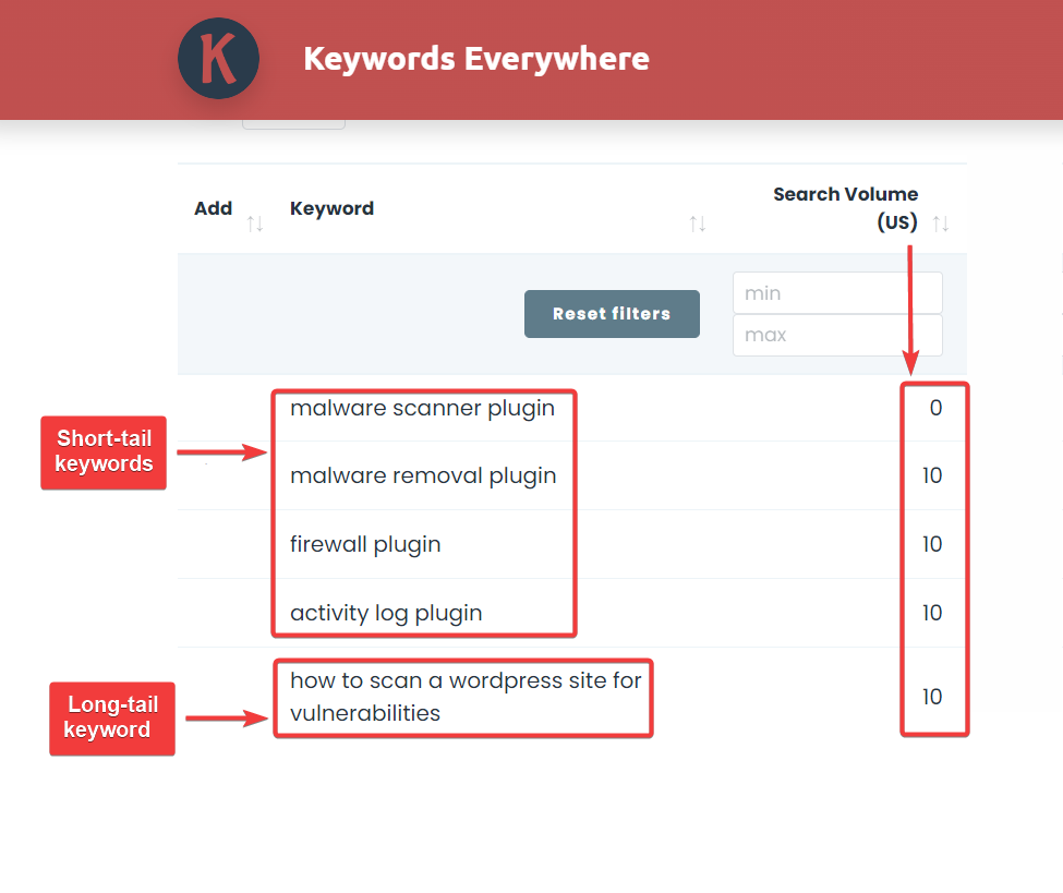 - Выбор сочетания ключевых слов с коротким хвостом (например, «сканер вредоносных программ») и ключевых слов с длинным хвостом (например, «как сканировать сайт WordPress на наличие уязвимостей»).