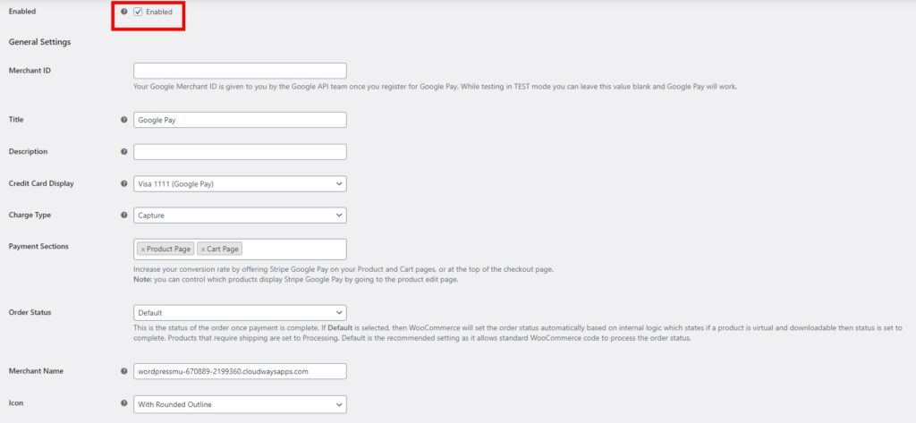 Здесь вам будут представлены все варианты Google Pay. Прежде всего, вам нужно установить флажок «Включено», чтобы включить Google Pay для вашего магазина.