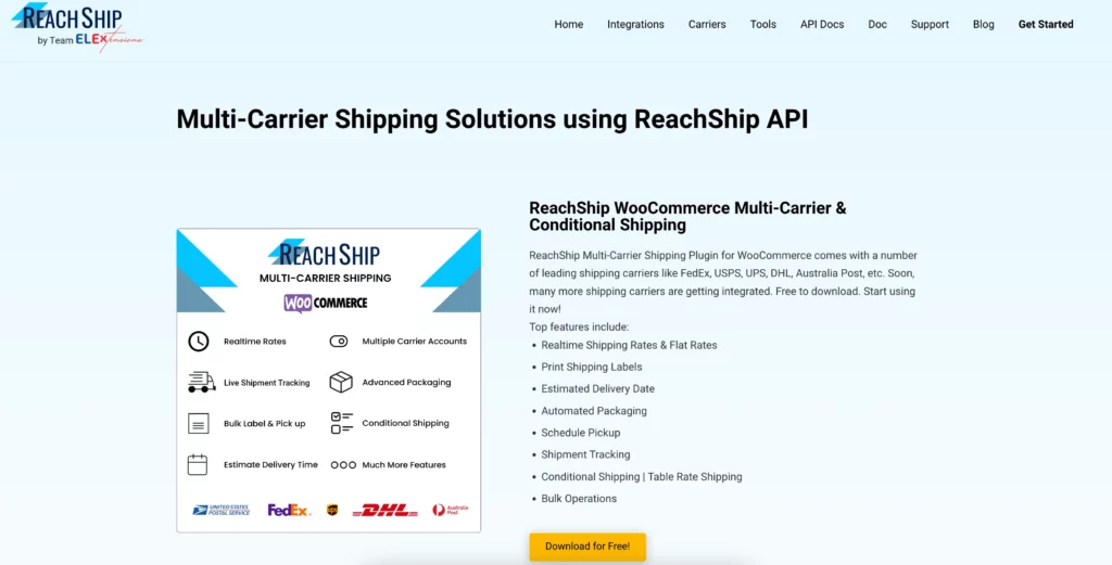 Плагин ReachShip Multi-Carrier Shipping для WooCommerce доступен для бесплатного скачивания. Он предлагает интеграцию с несколькими ведущими перевозчиками, такими как FedEx, USPS, UPS, DHL, Australia Post и другими, при этом в будущем планируется интеграция с дополнительными перевозчиками.