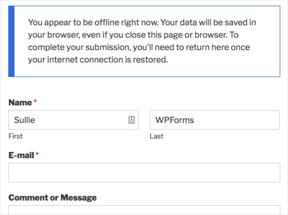 Дополнение Offline Forms позволяет вашим пользователям сохранять введенные данные в автономном режиме. Затем они могут отправить его, когда их подключение к Интернету будет восстановлено.
