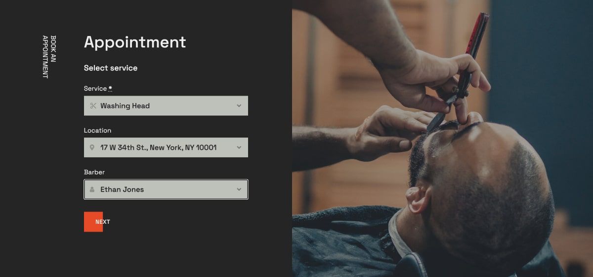 ในการสาธิต Bro Barbershop คุณสามารถสังเกตเห็นสถานที่หลายแห่งที่มีวิดเจ็ตการจองวางอยู่ ในแถบนำทาง หน้าแรก และหน้าภายในหลายหน้า (เช่น หน้าส่วนตัวของช่างตัดผมหรือรายการบริการ)