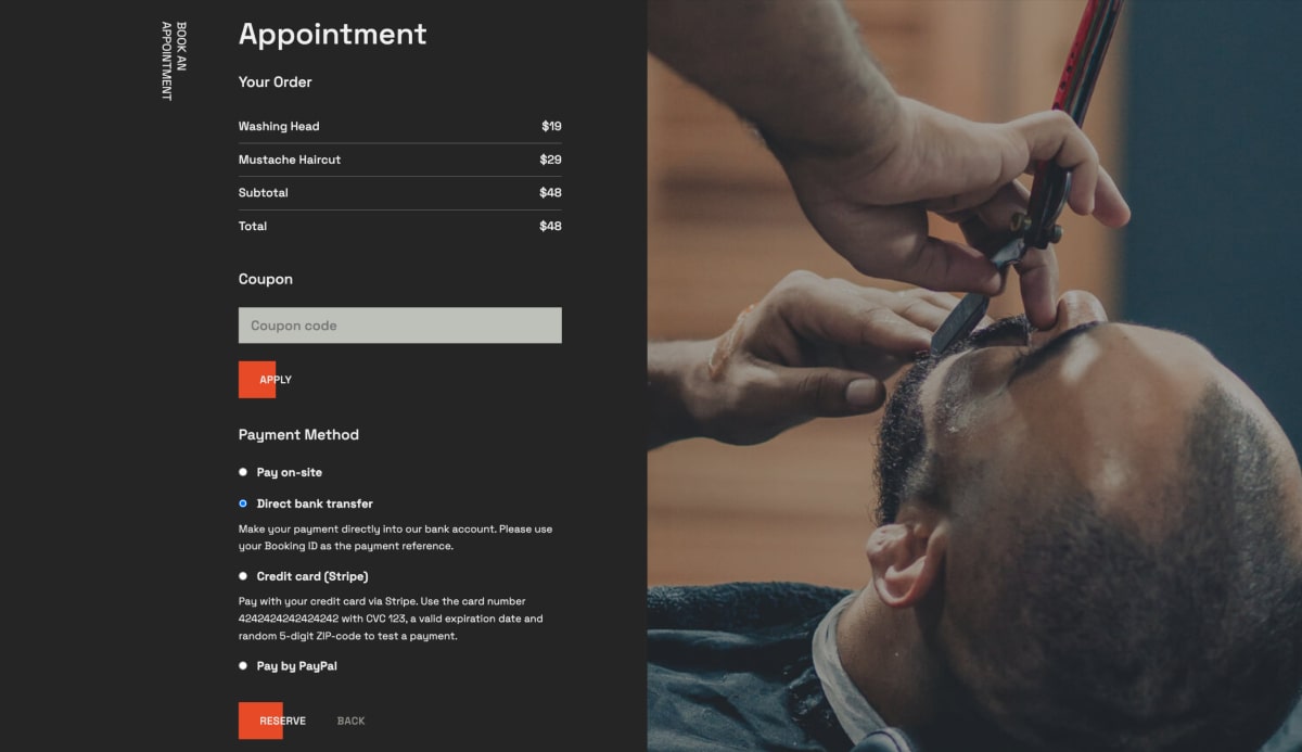 ขั้นตอนการจองนั้นง่ายมาก: ลูกค้าเลือกบริการ วันที่และเวลา และอาจเลือกช่างตัดผมก็ได้ การสาธิตแสดงวิธีการชำระเงินรวมอยู่ด้วย แต่คุณสามารถใช้กับเวอร์ชันปลั๊กอิน PRO เท่านั้น ในเวอร์ชันฟรี การจองทั้งหมดสามารถอนุมัติได้โดยอัตโนมัติ