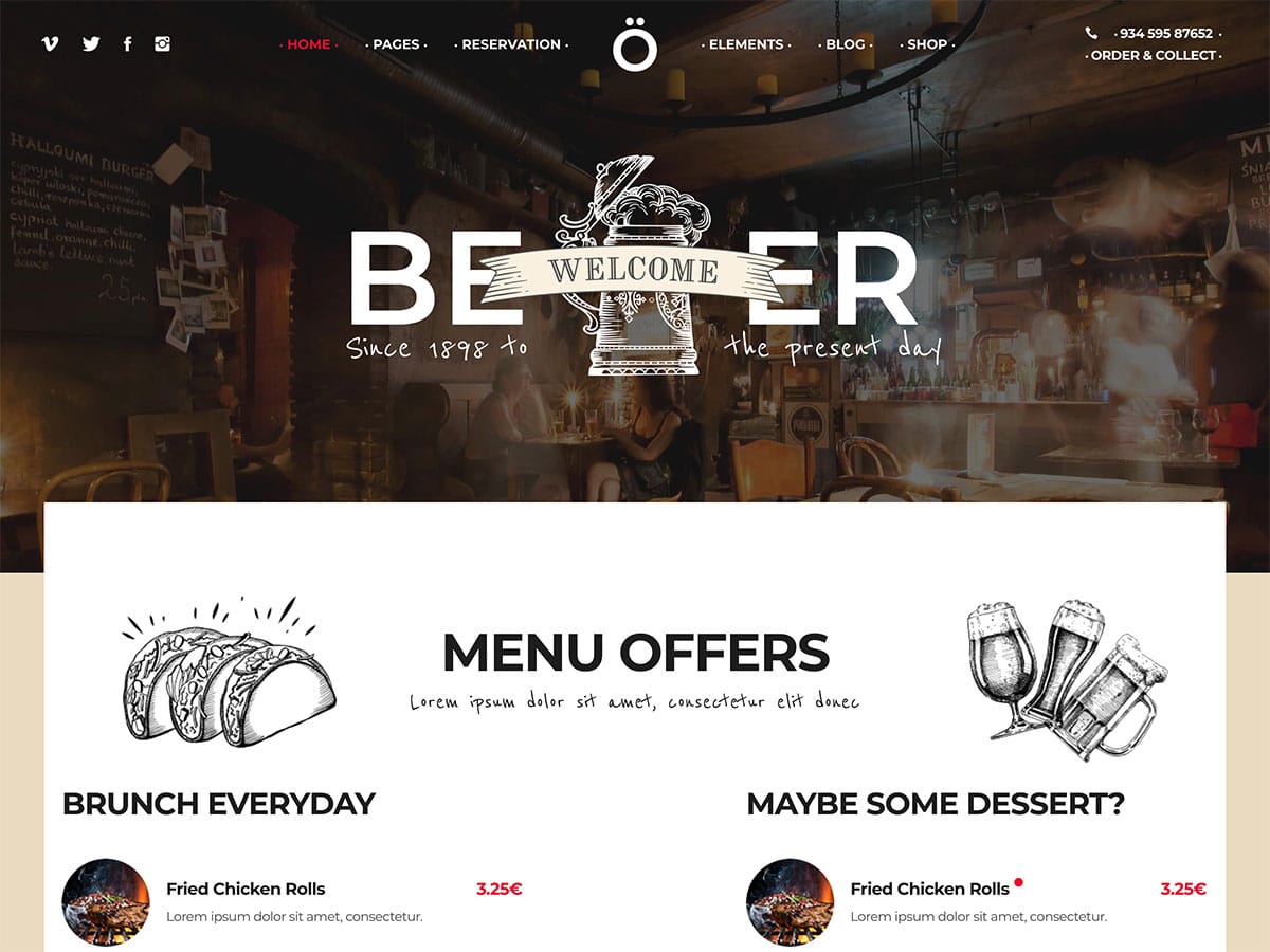 เค้าโครงหน้าแรกของเว็บไซต์โรงเบียร์เริ่มต้นส่วนที่เหลือประกอบด้วยส่วนสำหรับเมนู ระบบการจองสำหรับจัดการการจองออนไลน์ และรายละเอียดของเวลาเปิดทำการ สถานที่ และข้อมูลสำคัญอื่นๆ เกี่ยวกับธุรกิจของคุณ นอกจากนี้ยังมีวิดเจ็ตฟีดโซเชียลมีเดียที่กำหนดเองสำหรับแสดงรูปภาพจากบัญชี Instagram ของคุณในส่วนท้ายหรือแถบด้านข้างของเว็บไซต์ของคุณ