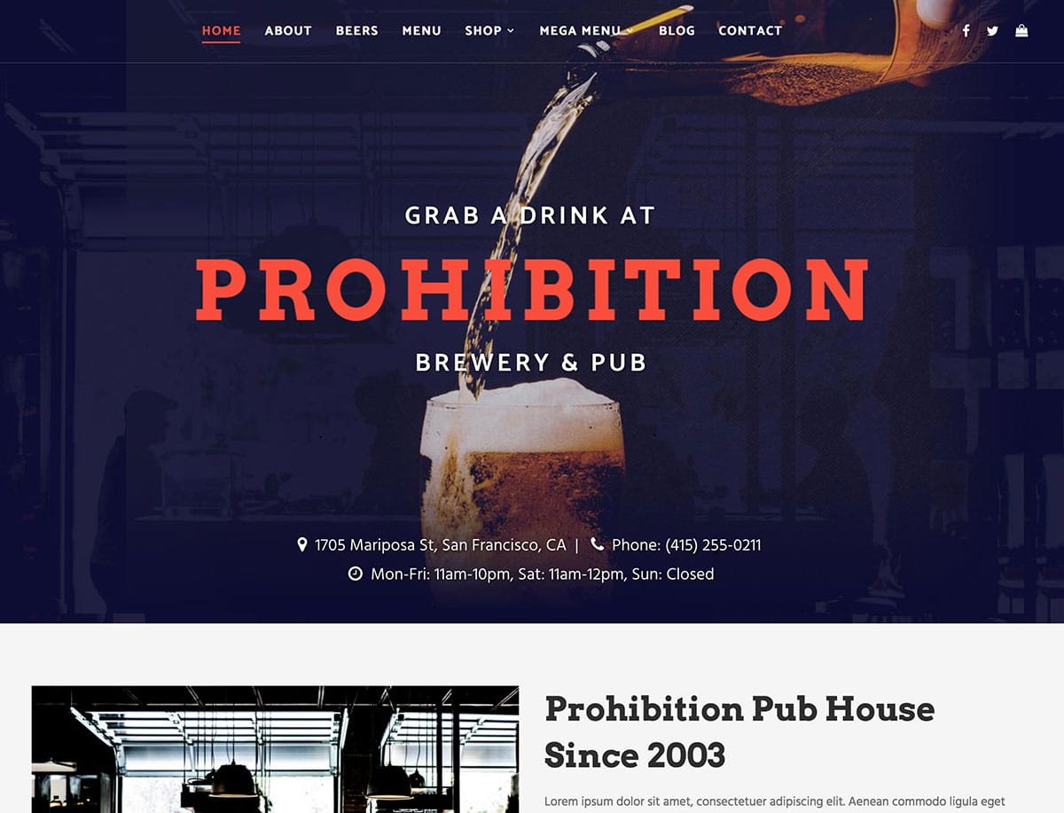 ไม่ว่าโรงเบียร์ของคุณจะเน้นไปที่การจัดหาเครื่องดื่มที่ดีที่สุดเท่านั้น หรือคุณเสนออาหารให้กับผู้เยี่ยมชมด้วย ธีมนี้มีทุกสิ่งที่คุณจำเป็นต้องใช้ในการเปิดตัวเว็บไซต์ที่มีสไตล์ด้วย WordPress อาจมีการสาธิตเว็บไซต์เพียงรายการเดียวในแพ็คเกจธีมห้าม แต่สิ่งนี้จะทำให้กระบวนการเปิดตัวเว็บไซต์โรงเบียร์ใหม่ของคุณง่ายขึ้น เพียงอัปโหลดไฟล์ธีม นำเข้าเนื้อหาสาธิต จากนั้นเริ่มเพิ่มข้อความและรูปภาพของคุณเองลงในไซต์ ไม่จำเป็นต้องกังวลกับการเลือกตัวอย่างเว็บไซต์ พยายามตัดสินใจว่าจะใช้อันไหน ด้วยธีม Prohibition มีการออกแบบที่สร้างมาเพื่อจุดประสงค์เพียงอย่างเดียว